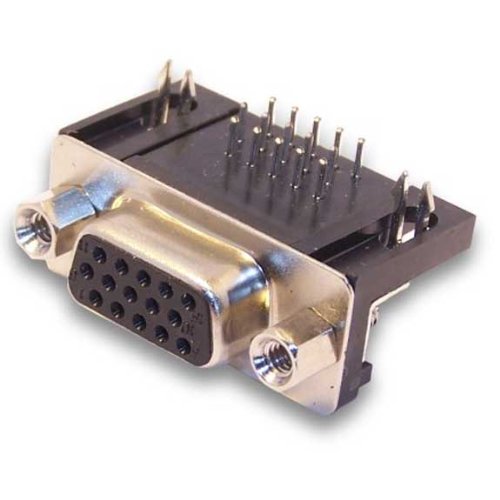 These DB15HD right angle connectors are designed to be mounted on printed circuit boards. All 15 pins and two mounting tabs (locking forks) extend through the circuit board, providing a convenient and sturdy connection. DB15HD connectors have 3 rows of pins as used on VGA connections. These connectors are the 0.350" set back style which is standard on high density connectors. This means that the distance between the connector face and the closest row of pins is .350". See the drawing below.