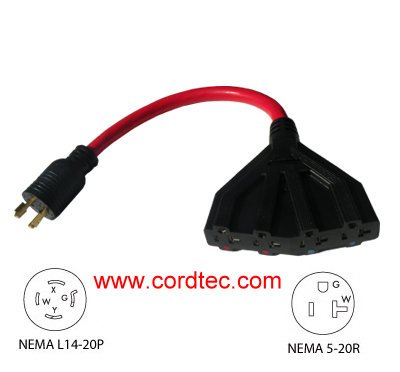 Product Description Generator Locking Extension Cord Locking 20A 125/250V to Straight Blade 15A/20A 125V, With "T" terminal-fitting, NEMA 5-20R Flabellate connector, Quaternity Outlet NEMA L14-20P male plug, Max Power: 5000W Rating 20A 125/250V to 20A 125V Cable SJTW 10/4 Cord Length 1.5ft Configuration NEMA L14-20P/NEMA 5-20R Approval Plug, Connector, and SJTW: UL, C-UL Warranty Limited one year warranty